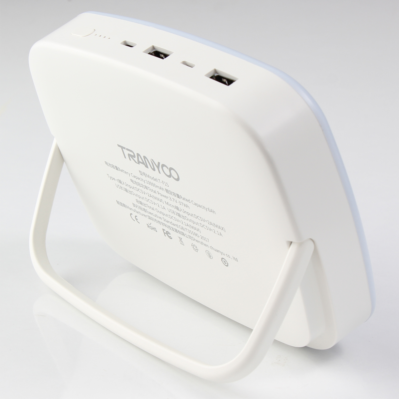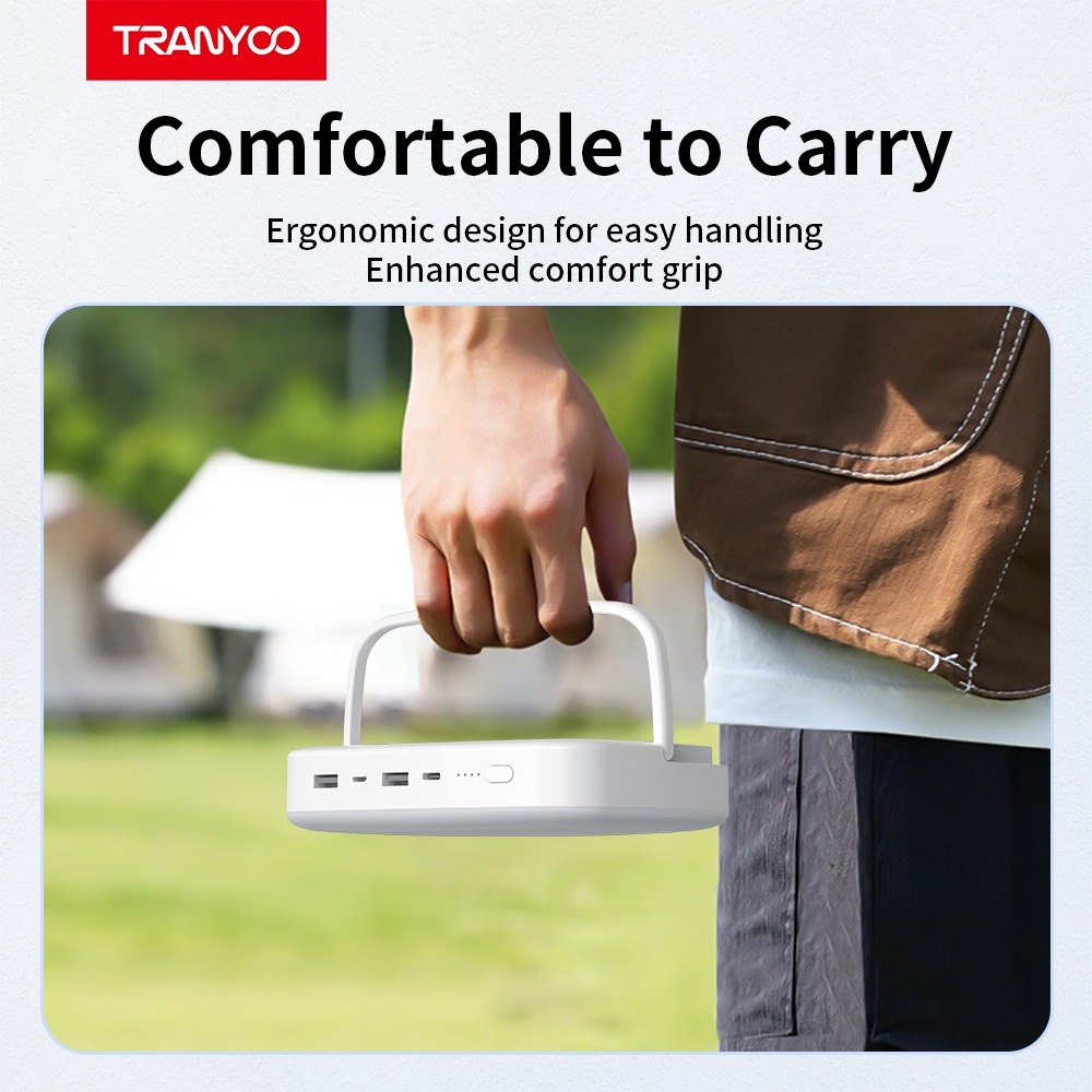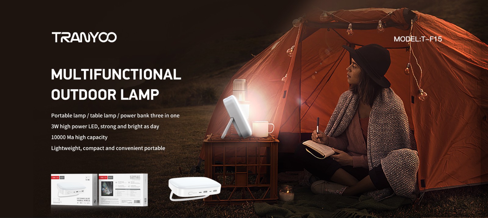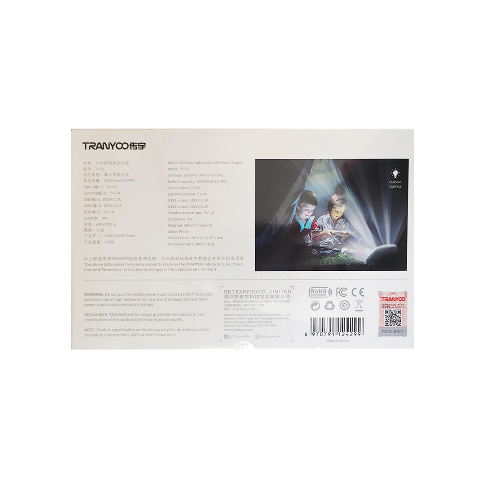 پاوربانک ترانیو مدل F15، دارای باتری لیتیوم-پلیمری با ظرفیت 10000 میلی آمپر می باشد که سی و پنج ال ای دی با توان سرجمع 3 وات بر رویش تعبیه شده است که از آن میتوان برای چراغ مطالعه، روشنایی چادر و طبیعت گردی استفاده کرد. این پاوربانک دارای دو خروجی USB با توان 2.1 آمپر و دو ورودی Type-C و Micro برای شارژ پاوربانک می باشد. همچنین یک دکمه برای روشن کردن ال ای دی میزان شارژ و روشن کردن چراغ، بر روی پاوربانک تعبیه شده است. این پاوربانک دارای دسته ای برای نگه داری، حمل و نقل و قلاب کردن دارد که به راحتی قابل استفاده است و استحکام بسیار مناسبی داراست. بدنه ی این پاوربانک برای معصوم ماندن در شرایط سخت فیزیکی مقداری بزرگتر طراحی شده است تا از آسیب های ناشی از سقوط در امان باشد. همچنین سطح پهن آن استحکاک بیشتری نسبت به پاوربانک های معمولی برای نگه داری روی سطوح داراست.با فناوری شارژ سریع QC 3.0 به صورت خودکار مدت زمان مورد نیاز برای شارژ دستگاه های پشتیبانی شده را کاهش می دهد.پاوربانک T-F15 دارای تکنولوژی حفاظت از باتری برای جلوگیری از گرم شدن بیش از حد باطری می باشد.
