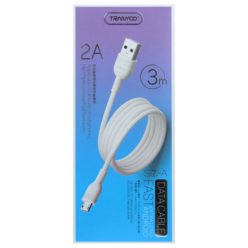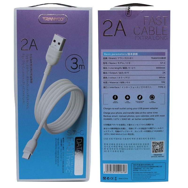 کابل مدل S7 برند ترانیو، به رابط نوع یو اس بی به ایفون و تایپ سی و میکرو مجهز است و براساس شدت جریان خروجی برابر با ۲ آمپر، گوشی های موبایل، تبلت ها و دیگر دستگاه های سازگار با این پورت را با سرعت بالایی شارژ می کند. طول این کابل فست شارژ در حدود ۳ متر می باشد که آزادی عمل بسیار عالی را در اختیار کاربران هنگام بازی یا گشت و گذار در اینترنت موقع عملیات شارژ، قرار می دهد. روکش آن از جنس TPE پوشیده شده است که در برابر خمیدگی، کشش، پارگی و گره خوردن مقاومت بالایی به همراه دارد و همچنین کانکتور های آن از فلز ساخته شده اند و در برابر ضربه و فشار استحکام خوبی خواهند داشت. کابل Tranyoo S7 ، علاوه بر شارژ دستگاه های هوشمند، مناسب برای انتقال اطلاعات نیز می باشد.