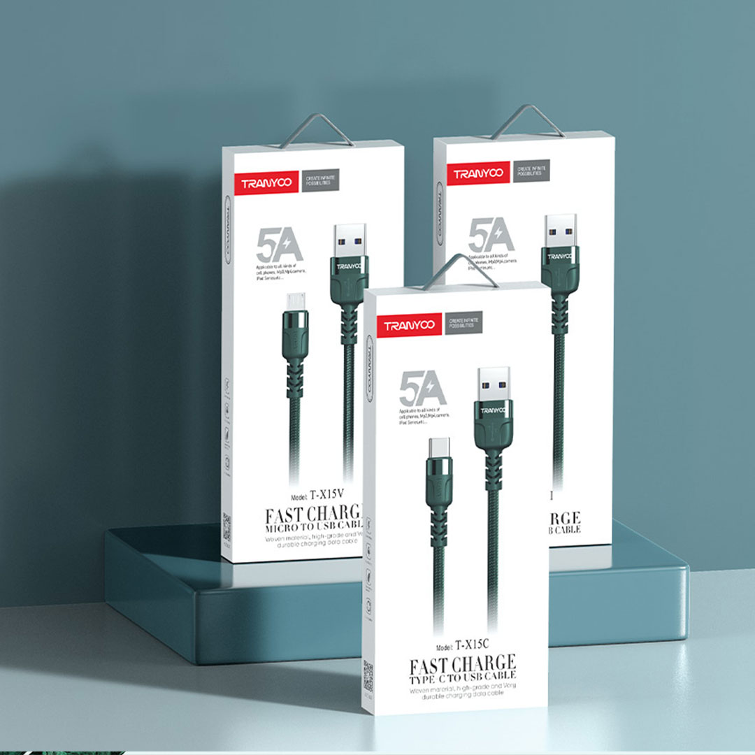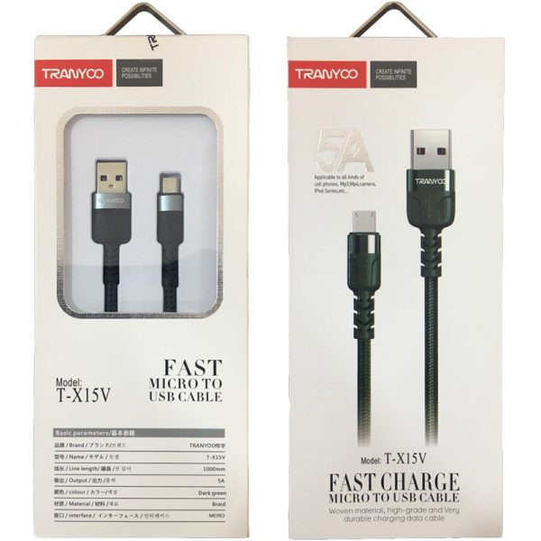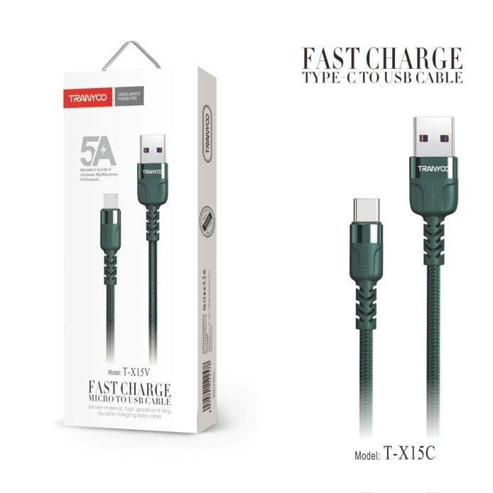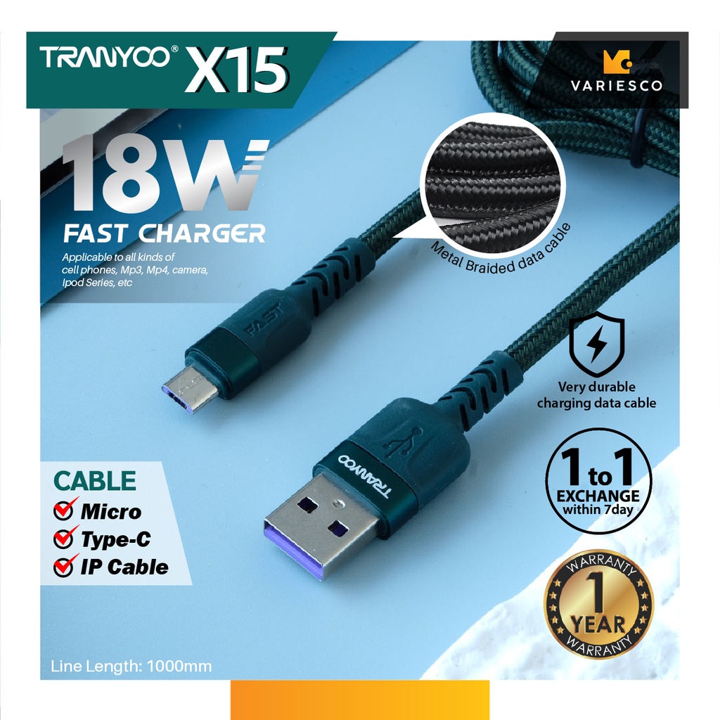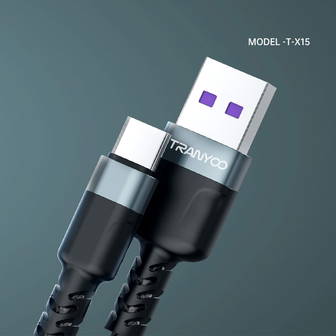 کابل شارژ ترانیو X15 از شرکت ترانیو یک کابل شارژ و انتقال داده با سرعت بالاست.این کابل در سه مدل آیفون( Lightning ) اندروید( Micro USB ) تایپ سی( Type-C ) تولید شده است.بدنه کابل X15 از جنس فلز و PVC ساخته شده است که باعث افزایش انعطاف پذیری و طول عمر این محصول می شود . وجود این پوشش روی کابل دوام زیادی به آن بخشیده است. همچنین با توجه به طراحی تخت این محصول به ندرت دچار گرهخوردن میشود و اگر آن را داخل کیف و یا جیب خود قرار دهید،به هم نمیپیچد.کابل X15 دارای می تواند اطلاعات و تصاویر و دیتای شما را با سرعت بالا منتقل کند. این کابل برای شارژکردن بیشتر پاوربانکها هم به کار میرود؛ همچنین با توجه به امکان انتقال اطلاعات در این کابل بهراحتی میتوانید انواع فایلهای خود را به اشتراک بگذارید.کابل شارژ و انتقال دیتا X15 با حداکثر شدت جریان عبوری 5 آمپر، قابلیت شارژ سریع را برای گوشیهای موبایل و دیگر دستگاههای سازگار با این پورت فراهم میکند.تمامی مدلهای کابل X15 برند ترانیو Tranyoo با بدنهای محکم و پوشش کنفی محافظت شده، قابلیت شارژ سریع و انتقال داده با سرعت بالا را دارند.