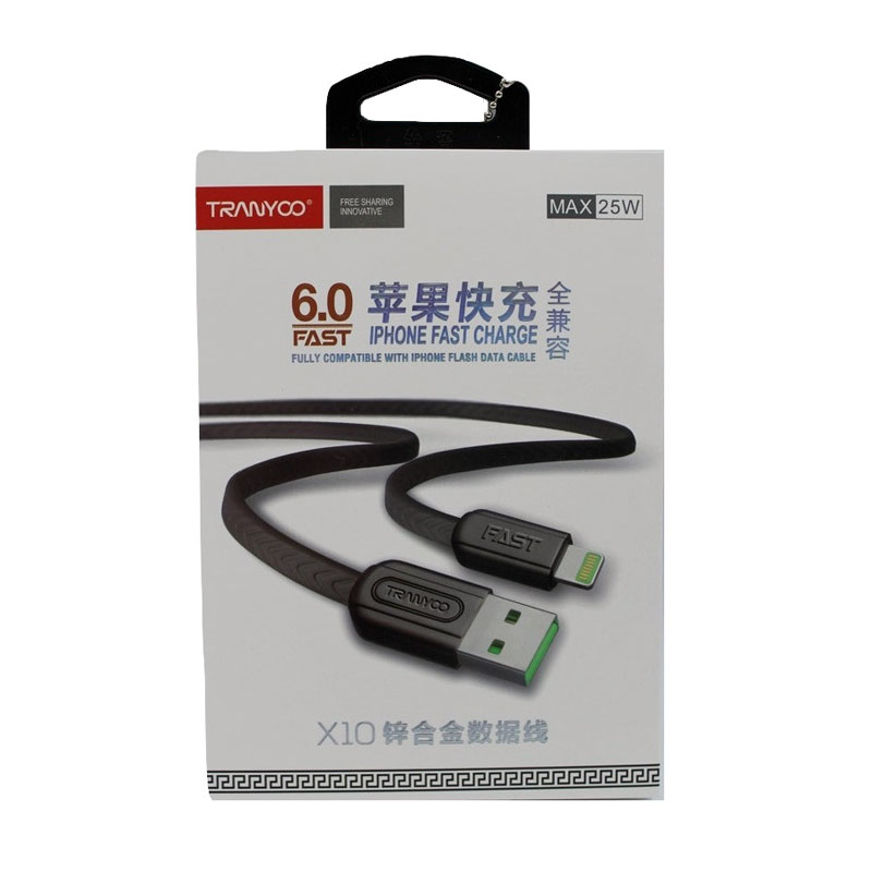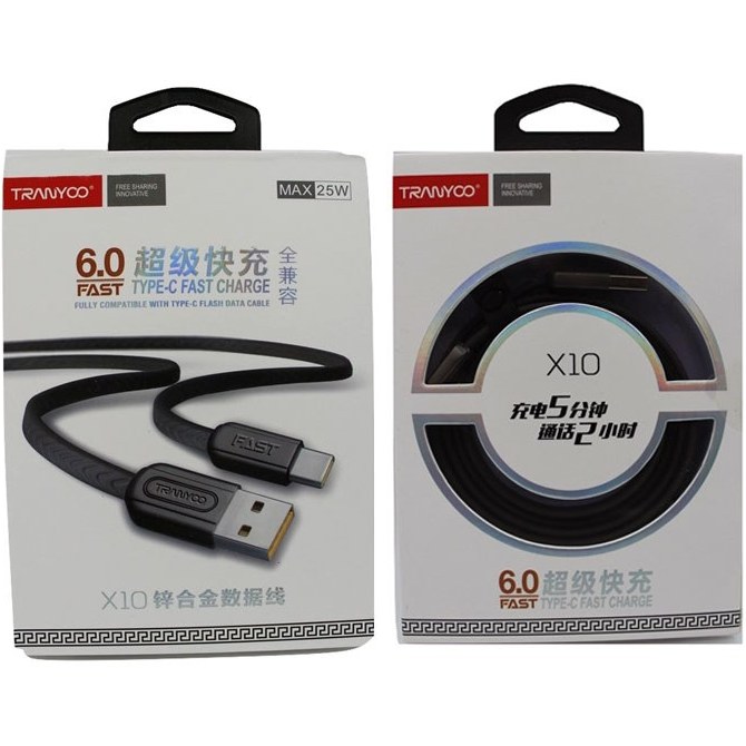 کابل X10 محصولی از کمپانی TRANYOO بوده که به شما این امکان را می دهد تا بتوانید دستگاه هوشمند خود را با شدت جریان ۶ آمپر و توان ۲۵ وات شارژ کنید که سرعت بسیار بالایی هم برای شارژ محسوب می شود و در نوع خود کم نظیر است.جنس روکش این کابل از پلاستیک TPE بوده، ظاهری تخت دارد و علاوه بر انعطاف پذیری قابل قبول،کاملا در برابر کشیدگی و پارگی مقاوم است. سیم های مسی به کار رفته در آن نیز جریان را بدون نوسان عبور داده و در صورت پشتیبانی دستگاهتان ار فست شارژ، آن را با سرعت بالا شارژ می کند.یکی از مشکلاتی که کاربران همیشه به آن برخورد می کنند گره خوردن کابل ها می باشد که در این محصول به طور کلی از بین رفته زیرا بدنه این کابل به صورتفلت و تخت طراحی شده که باعث شده تا مقاومت آن در برابر کشش و پارگی از سطح بالایی برخوردار باشد.طول این کابل ۱۰۰ سانتی متر بوده که برای استفاده های روزمره بسیار مناسب می باشد.سوکت های این محصول به صورت فلزی تولید شده تا در برابر فشار بالا و ضربه مقاوم باشد و به راحتی آسیبی به آن وارد نشود.