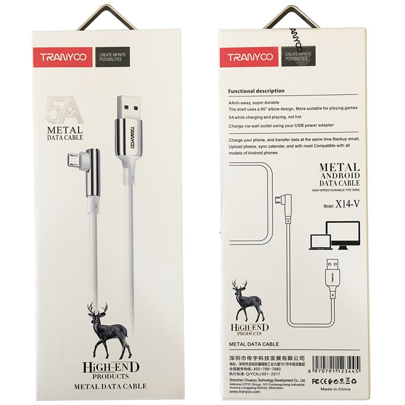 کابل شارژ ترانیو مدل TRANYOO X14-L محصولی از کمپانی خوش نام «ترانیو» (TRANYOO) دارای کانکتورهای لایتنینگ،تایپ سی و میکرو است. کابل X14 برای شارژ و انتقال دیتا و اطلاعات استفاده میشود و به طول ۱۰۰ سانتیمتراست .بدنه کابل X14 از جنس فلز و PVC ساخته شده است که باعث افزایش انعطاف پذیری و طول عمر این محصول می شود.وجود این پوشش روی کابل دوام زیادی به آن بخشیده است. همچنین با توجه به طراحی تخت این محصول به ندرت دچار گرهخوردن میشود و اگر آن را داخل کیف و یا جیب خود قرار دهید،به هم نمیپیچد. کابل X14 دارای می تواند اطلاعات و تصاویر و دیتای شما را با سرعت بالا منتقل کند. گفتنی است این محصول دارای شدت جریان ۵ آمپرو ولتاژ ۲۵ ولت است تا دستگاه شما را به سرعت شارژ کند.باتوجه به تکنولوژی به کار رفته در این نوع کابل های این شرکت نگرانی در جهت آسیب رساندن به باتری دستگاه هوشمند شما وجود نخواهد داشت.سرهای کابل از فلز ساخته شده که علاوه بر عمر طولانی تر محصول باعث زیبایی محصول شده است.