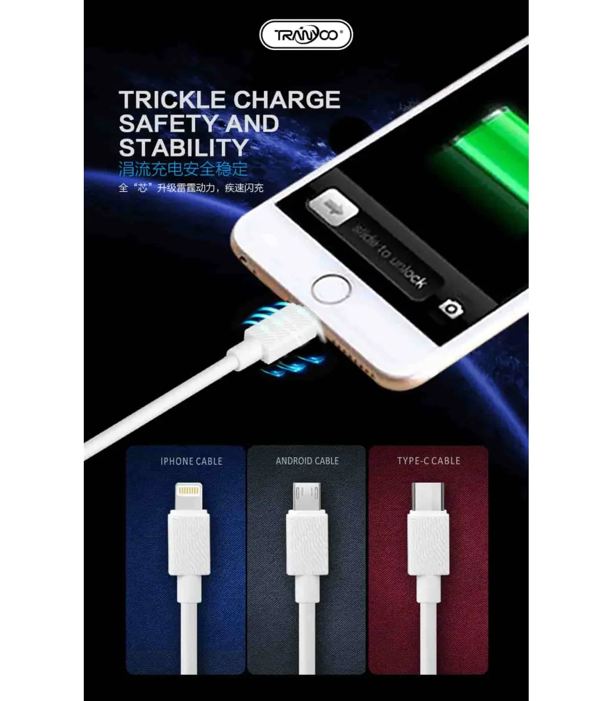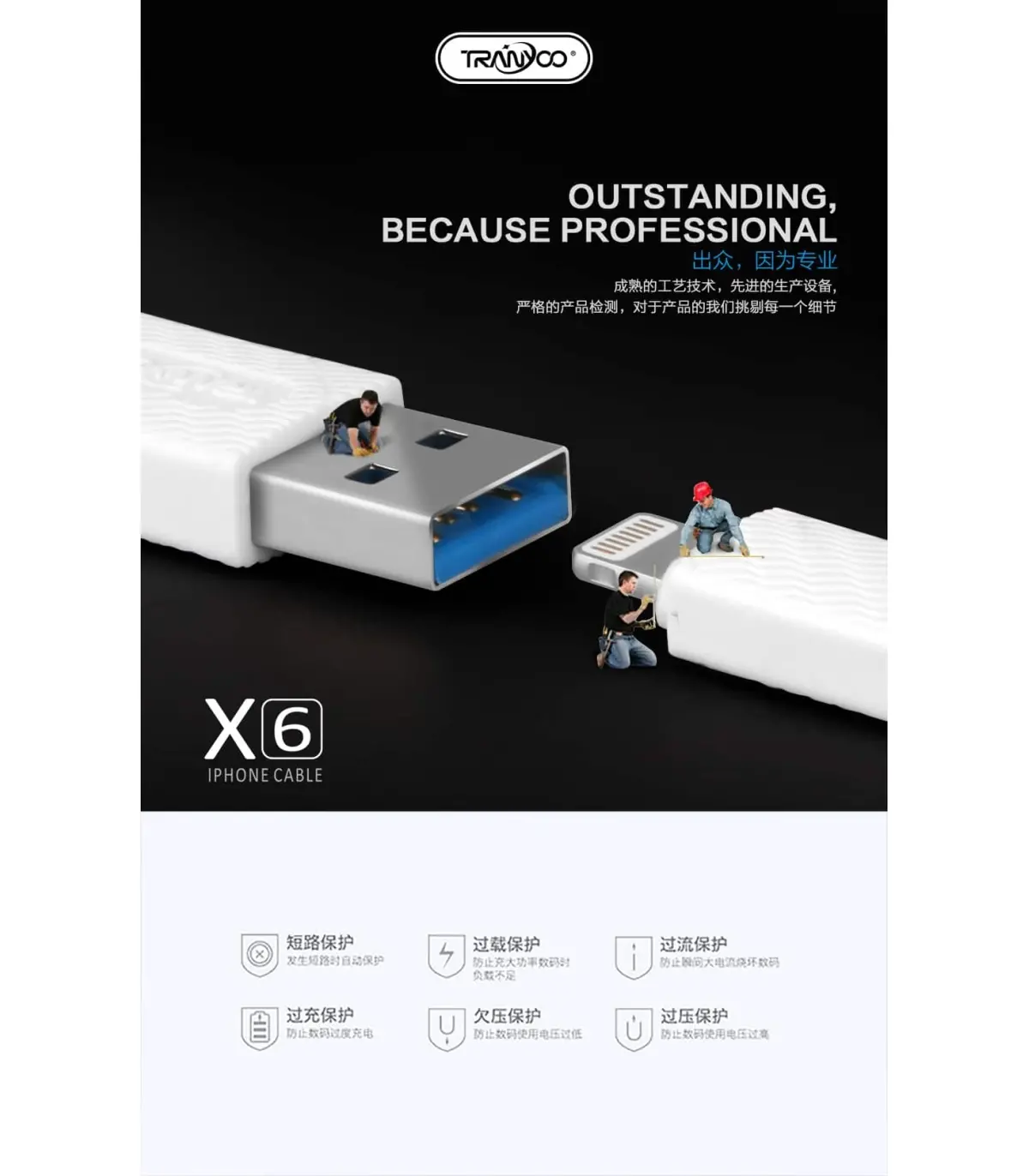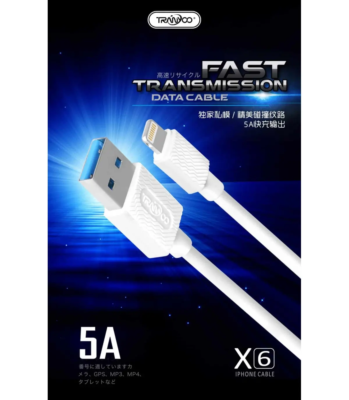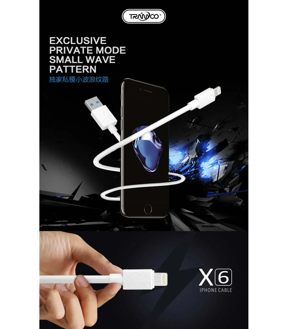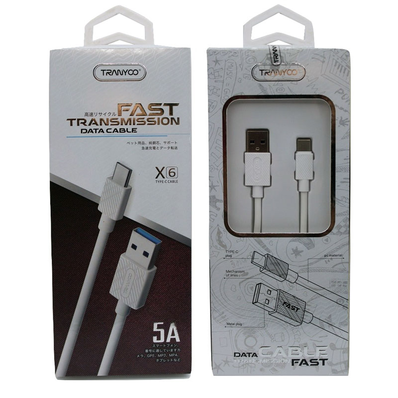 کابل «X6» محصولی از برند «ترانیو» (Tranyoo) است.شما میتوانید از این کابل برای شارژ و انتقال اطلاعات نیز استفاده کنید و دارای طول 100 سانتیمتر است. کابل X6 از پوشش بدنه پلاستیکی از جنس پلیکربنات ساخته شده که باعث افزایش دوام و استحکام این محصول شده است. کابل X6 در یک طرف دارای کانکتور USB است که می تواند اطلاعات را با سرعت بسیار زیادی منتقل کند پس اگر به دنبال کابلی برای انتقال اطلاعات هستید، X6 گزینه بسیار مناسبی است. از دیگر ویژگی این محصول امکان پشتیبانی آن از شدتجریان 5 آمپر را میتوان نام برد که شدت جریان بسیار مطلوبی است . بنابراین، شارژ دستگاه هوشمند شما با استفاده از این محصول به سرعت انجام خواهد شد. البته باید در نظر داشته باشید، شارژرتان هم باید از شدتجریان بالا پشتیبانی کند. وجود امکان شارژ سریع هم بر ارزش خرید این محصول اضافه کرده است و میتوانید از این محصول برای انتقال سریع اطلاعات هم استفاده کنید.