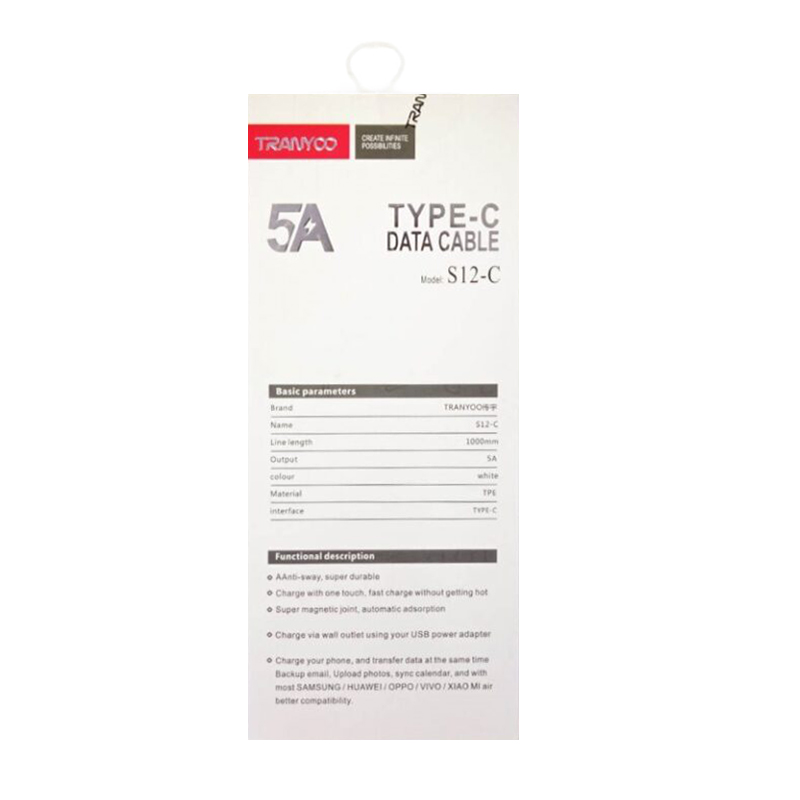 کابل مگنتی ترانیو S12 یک کابل شارژ و انتقال داده برای دستگاههای موبایل است.در 3 مدل با پورت Lightning آیفون،تایپ سی و میکرو با طول 1 متر قابلیت شارژ سریع و سازگار با تمامی دستگاههای موبایل میباشد.دارای بدنهای پلاستیکی که قابلیت شارژ دستگاههای مختلف را دارد.این کابل شارژ با طول مناسب میتواند به راحتی با دستگاههای مختلف اتصال برقرار کند.با قابلیت شارژ سریع Quick Charge 3.0 میتواند در کوتاه ترین زمان ممکن دستگاه شما را شارژ کند.همچنین این کابل دارای پوشش کابل TPE میباشد که مانع از خم شدن، چرخش یا سایش در طولانی مدت میشود.و باعث افزایش طول عمر کابل و ارتباط بهتر برای اتصال به دستگاههای مختلف میباشد.در کل کابل شارژ S12 از برند ترانیو TRANYOO با داشتن مدارهای حفاظتی مانند حفاظت از ولتاژ بالا، جریان بالا، گرمای بالا میباشد. با توجه به کیفیت ساخت و فناوری روز استفاده شده در این کابل قابلیت شارژ سریع میتوانید خود را از مشکلات باطری رها سازید.