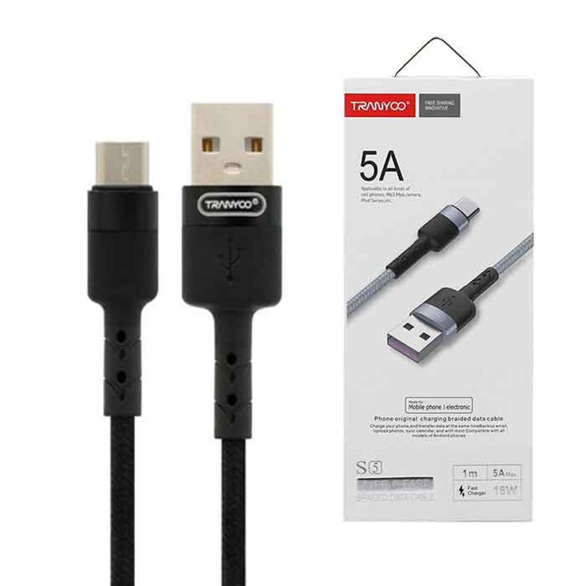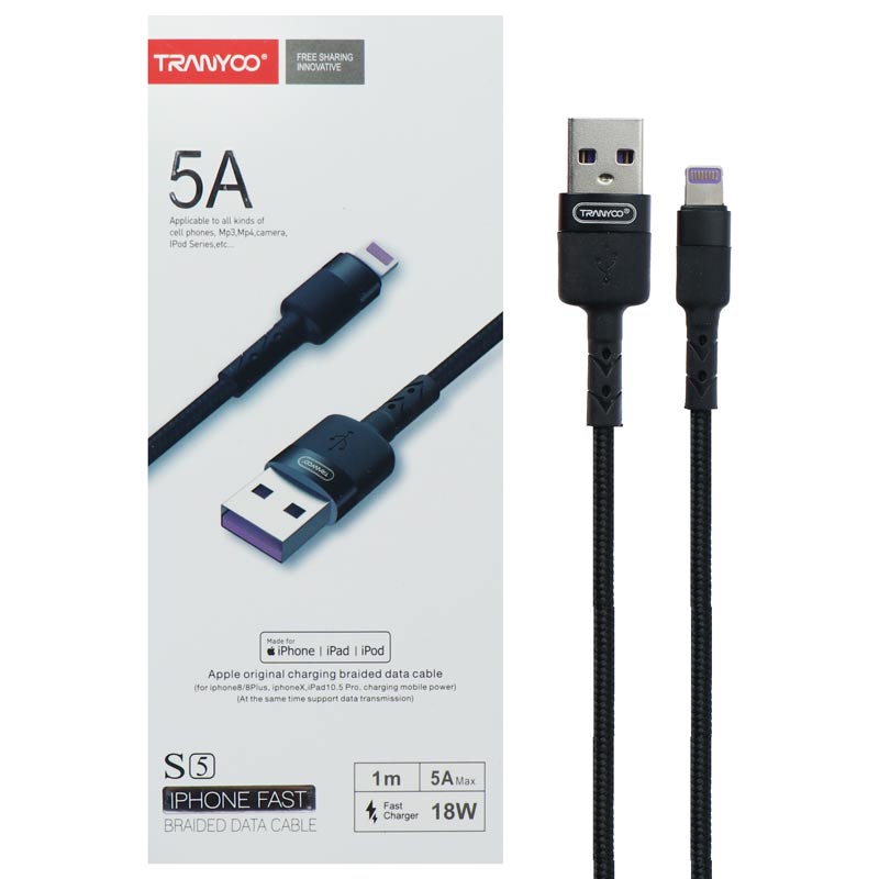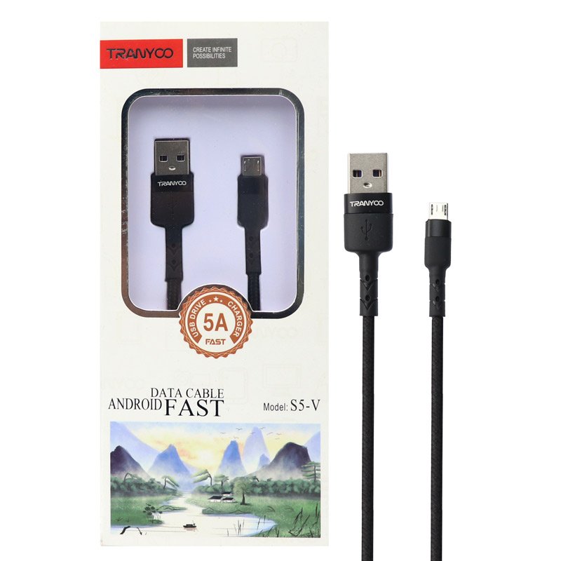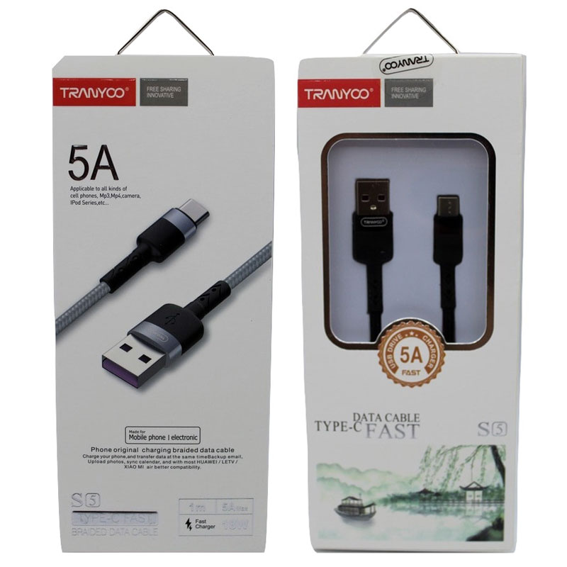 کابل «S5» محصولی از کمپانی خوش نام «ترانیو» (TRANYOO) دارای هر3 نوع کانکتور است. کابل S5 برای شارژ و انتقال دیتا و اطلاعات استفاده میشود و به طول ۱۰۰ سانتیمتراست. بدنه کابل S5 از جنس فلز و PVCو کنفی ساخته شده است که باعث افزایش انعطاف پذیری و طول عمر این محصول می شود . وجود این پوشش روی کابل دوام زیادی به آن بخشیده است.همچنین با توجه به طراحی تخت این محصول به ندرت دچار گرهخوردن میشود و اگر آن را داخل کیف و یا جیب خود قرار دهید،به هم نمیپیچد. کابل S5 می تواند اطلاعات و تصاویر و دیتای شما را با سرعت بالا منتقل کند.گفتنی است این محصول دارای شدت جریان ۵ آمپرو ولتاژ ۲۵ ولت است تا دستگاه شما را به سرعت شارژ کند.باتوجه به تکنولوژی به کار رفته در این نوع کابل های این شرکت نگرانی در جهت آسیب رساندن به باتری دستگاه هوشمند شما وجود نخواهد داشت.علاوه بر این کابل S5 از شرکت ترانیو دارای محافظت های امنیتی است که برای جلوگیری از خطرات مربوط به افزایش جریان برق شوک الکتریکی طراحی شده است.
