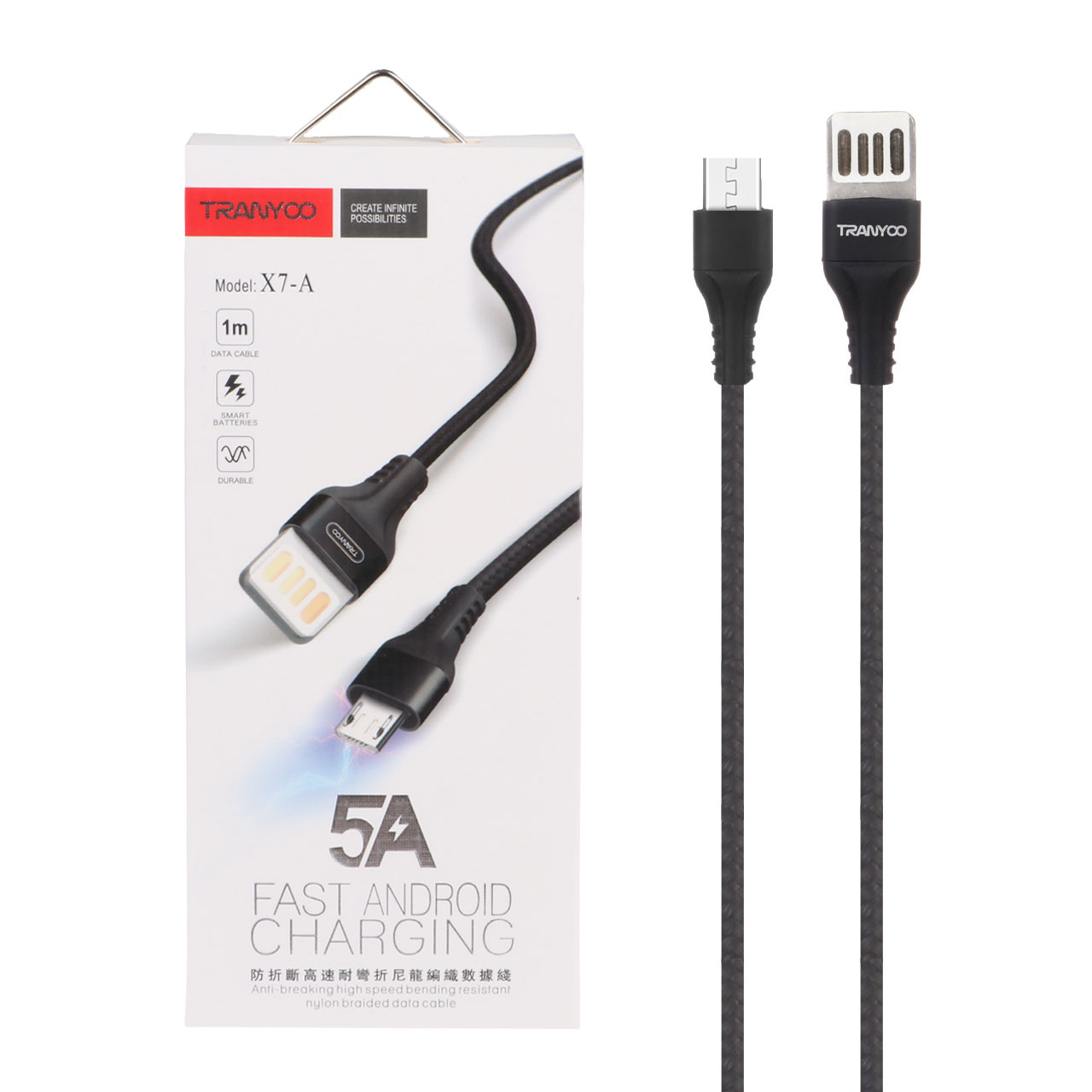 کابل فوق العاده بادوام کمپانی ترانیو مدل X7-A به راحتی اتصال گوشی ها،تبلت ها و گجت های شما به رایانه و شارژر را ممکن می کند. محافظت این کابل ۱۰۰ سانتی متری بر عهده روکش نایلونی آن می باشد که مقاومت نسبتا مناسبی در برابر کشیدگی و پارگی برای آن به ارمغان می آورد. متریال ساخت کانکتورهای این کابل نیز از جنس فلز می باشد تا شما نگرانی بابت خرابی این محصول در طولانی مدت نداشته باشید. این محصول از قابلیت شارژ سریع ۵ آمپری و انتقال اطلاعات به رایانه و گجت ها پشتیبانی می کند. ویژگی های این کابل مانند قابلیت شارژ سریع، انتقال اطلاعات به رایانه و کیفیت ساخت نسبتا مناسب آن را به یک کابل مناسب جهت اتصال به رایانه و شارژر تبدیل می کنند.جنس روکش کابل استفاده شده در این محصول از جنس TPE بوده که از انعطاف پذیری بالای برخوردار است و در برابر کشیدگی و پارگی از مقاومت خوبی برخوردار است. در درون این کابل از سیم های مسی استفاده شده است و قادر است تا ۵ آمپر جریان را از خود عبور دهد.