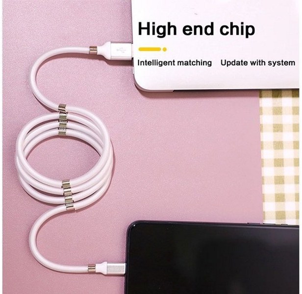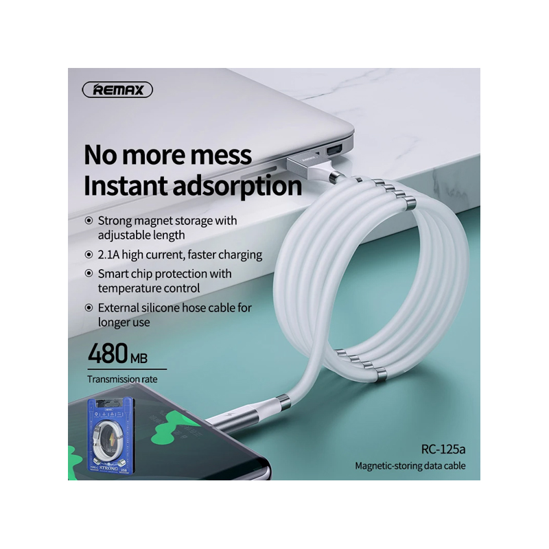 کابل شارژ مگنتی جمع شو ریمکس با داشتن 10 مگنت در نقاط مختلف کابل قابلیت این را دارد که پس از استفاده آن را مثل روز اول جمع کنید همچنین این کابل قابلیت فست شارژ دارد و انتقال اطلاعات بین کامپیوتر و گوشی را فراهم میکند.تقریباً در هر 5 سانتیمتر، یک حلقه آهنربا وجود دارد که به کابل کمک میکند تا خود را به صورت دایره وصل کند و کاملاً مرتب شود. این به شما کمک خواهد کرد که در جمع کردن سیم شارژ وقت تلف نکنید و تنها در عرض 1 ثانیه کابل را جمع و مرتب کنید.قابلیت شارژ و انتقال داده همزمان با قابلیت شارژ سریع با حداکثر شدت جریان خروجی 2.1 آمپرمجهز به تراشه هوشمند جهت محافظت از باتری دستگاه در برابر تغییرات شدت جریان، ولتاژ اضافی و افزایش دما، از طرف دیگر تراشه هوشمند میتواند میزان جریان ورودی دستگاه را به طور خودکار تشخیص دهد و بدین ترتیب منبع را متناسب با آن تنظیم کند.این کابل با یک لایه پلاستیکی نرم شفاف پوشانده شده است تا از خطای نشت الکتریکی جلوگیری کند، ساخته شده از مواد PC با لایههای ضد حریق و آتش سوزی، بسیار مقاوم در برابر پارگی، خمش، کشش با طول عمر زیاد